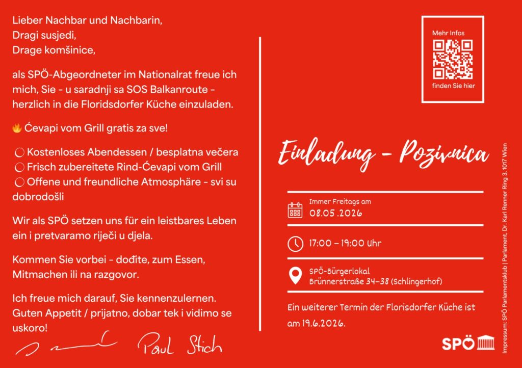 Floridsdorf, Wien – Floridsdorfer Küche ulazi u svoju osmu rundu – i ovog puta postavlja kulinarski vrhunac uz Balkan-Specijal. U saradnji sa organizacijom SOS Balkanroute, inicijativa poziva na otvoreno komšijsko veče uz sveže grilovane ćevapčiće – besplatno za sve. Nakon velikog uspeha prethodnog izdanja sa preko 100 gostiju, kapaciteti se sada šire: više ljudi,… Floridsdorfer Küche 8.0: Balkan-Specijal uz SOS Balkanroute weiterlesen -