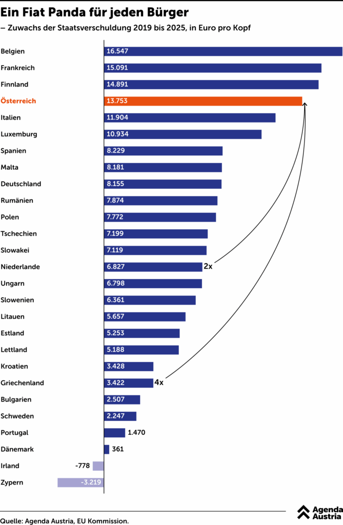 Posebno je alarmantan razvoj državnog duga. Od 2019. godine, dug po glavi stanovnika porastao je za skoro 14.000 evra. Analiza Agenda Austria jasno pokazuje dimenziju ovog razvoja: To je dvostruko više nego u Holandiji i čak četiri puta više nego u Grčkoj, zemlji koja je dugo bila sinonim za dužničku krizu.