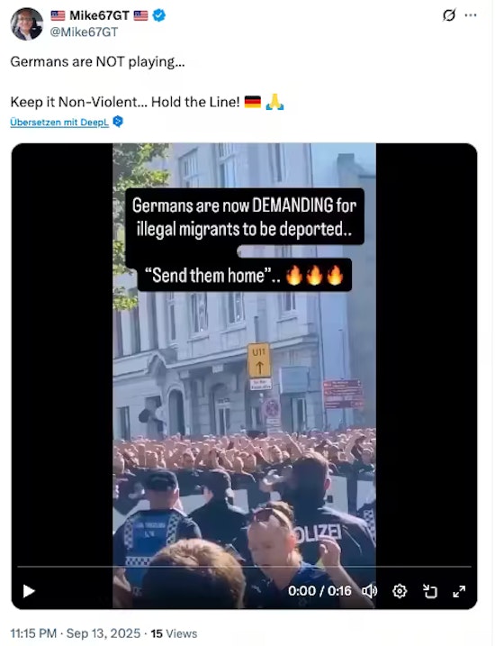 Tvrdnja da su i u Deutschlandu hiljade ljudi izašle na ulice protiv migracije, potkrepljena je video snimkom koji je postao viralan. Na njemu se vidi velika grupa ljudi u crnoj odeći koja uzvikuje parole.