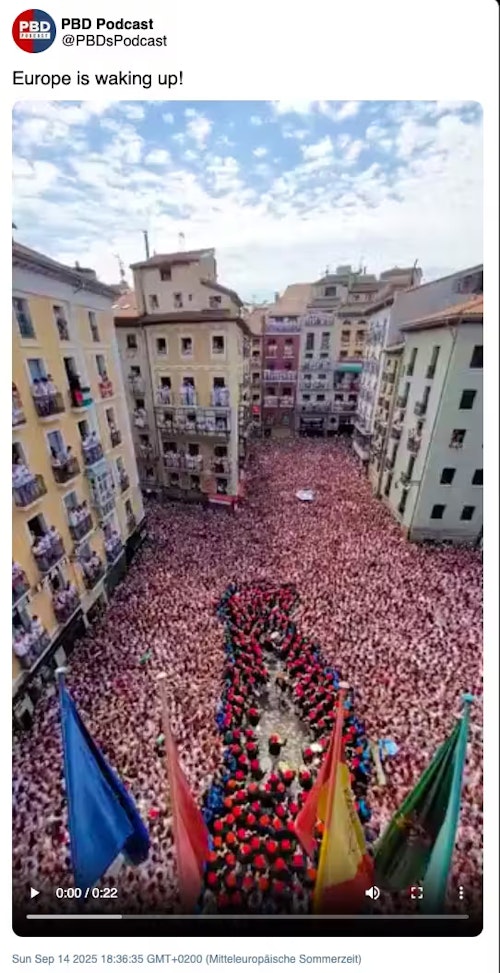 Treći viralni klip, koji navodno pokazuje kako se „Europa budi“, prikazuje prepun trg sa stotinama hiljada ljudi.