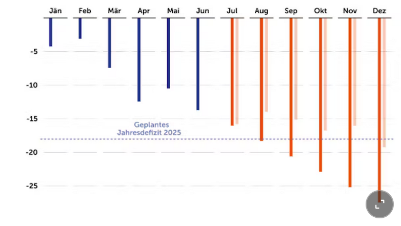 Liberalni ekonomski thinktank Agenda Austria sada diže uzbunu. Ekonomista Hanno Lorenz kritikuje da kurs štednje jedva da pokazuje ikakav efekat. Već sredinom godine je dostignuto oko tri četvrtine planiranog budžetskog deficita za celu 2025. godinu. Aktuelni deficit je čak 70 miliona eura veći nego u prethodnoj godini. „Iako su prihodi u prvoj polovini godine snažno porasli, država i dalje nema kontrolu nad svojim rashodima“, objašnjava Lorenz. Uprkos najavljenim merama štednje, dodatni rashodi su veći od prihoda države.