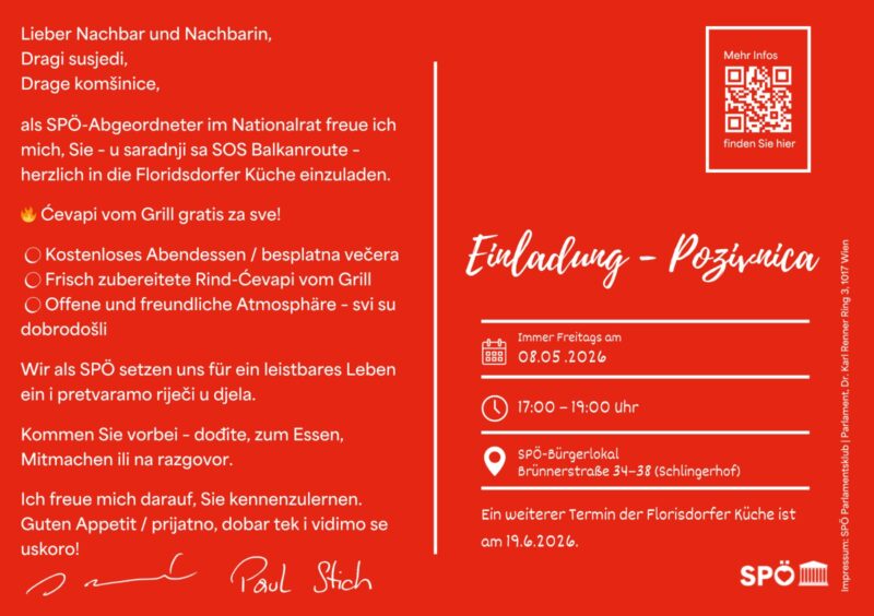 Floridsdorf, WienFloridsdorfer Küche ulazi u svoju osmu rundu – i ovog puta postavlja kulinarski vrhunac uz Balkan-Specijal. U saradnji sa organizacijom SOS Balkanroute, inicijativa poziva na otvoreno komšijsko veče uz sveže grilovane ćevapčiće – besplatno za sve.