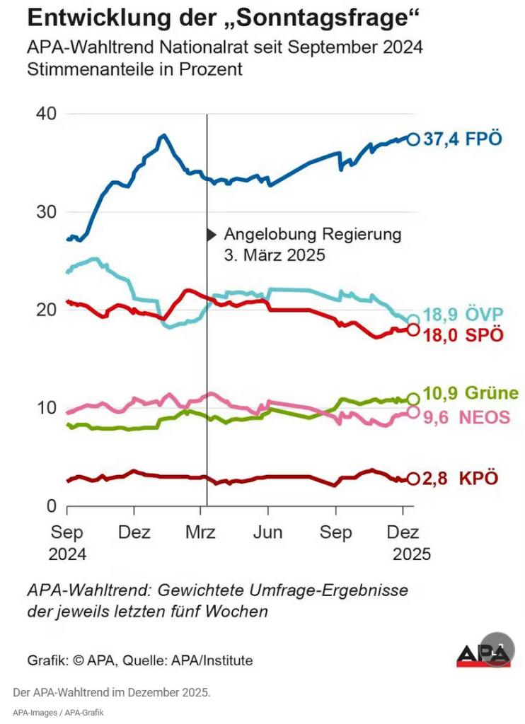 Iza dominantne FPÖ odvija se neizvesna borba za poziciju broj dva. ÖVP kancelara Christian Stocker nalazi se na 18,9 odsto, tek za dlaku ispred SPÖ. Andreas Babler sa svojim socijaldemokratama dostiže 18,0 odsto. Obe partije se vidno muče da u vladi izgrade sopstveni profil, a da pritom ne naruše partnerske odnose, što je hod po ivici koji do sada nije uspeo da povrati poverenje birača.