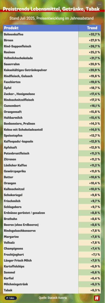 Brojke iz Statistik Austria nedvosmisleno pokazuju da poskupljenje u Österreichu ostaje tvrdokoran problem. Posebno kada su u pitanju namirnice, potrošači za skoro svaki proizvod moraju dublje da zavuku ruku u džep. Od mesa preko mlečnih proizvoda do kafe – eksplozija cena pogađa gotovo sve oblasti svakodnevnih potreba. Očekivano olakšanje i dalje se čeka.